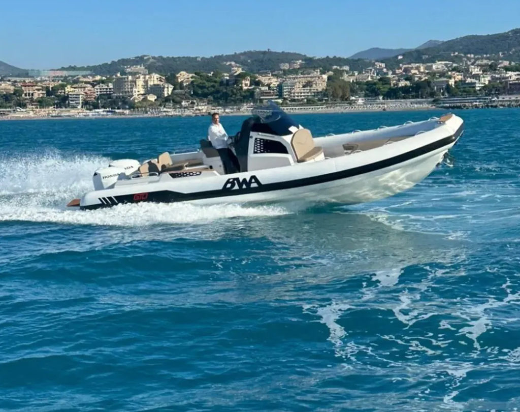 Gommone BWA Sport 26 GTO demo Luglio 2025 carbon White , lunghezza 775 cm larghezza 310 cm portata persone n. 18 peso a vuoto 1200 kg dotazioni : Cuscineria elegance completa a cellule chiuse, Musone in VTR a prua per verricello, Pompa di sentina, Pannello elettrico, Prendisole a poppa con prolunga, kit gamba tavolo poppa ,Serbatoio benzina 350 lt,Serbatoio acqua con impianto doccia e autoclave,, Consolle con vano x eventuale WC ,Timoneria idraulica, Luci di navigazione, quadretto elettrico batteria e staccabatterie ,Plancette extralunghe con scaletta di risalita ,Verricello elettrico con ancora e catena ,Optional: Prolunga sole di prua con gamba tavolo, tessuto carbon, Roll bar inox , Tendalino sole inox con prolunga di prua e telo laterale , frigorifero , gps cartografico Raymarine Element 7 , motore Honda BF 250 D Total white con comando chiesuola elettronico, display multifunzione honda 4.3, ore di moto 35